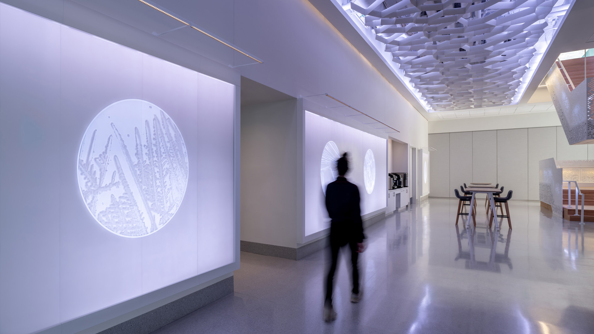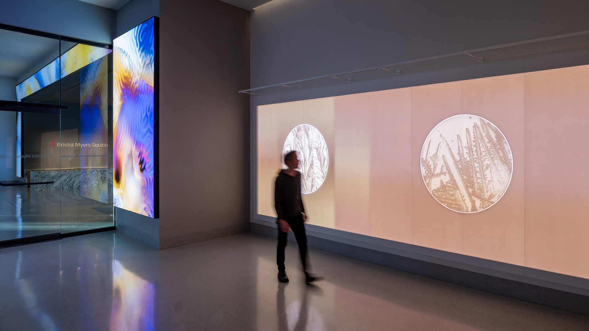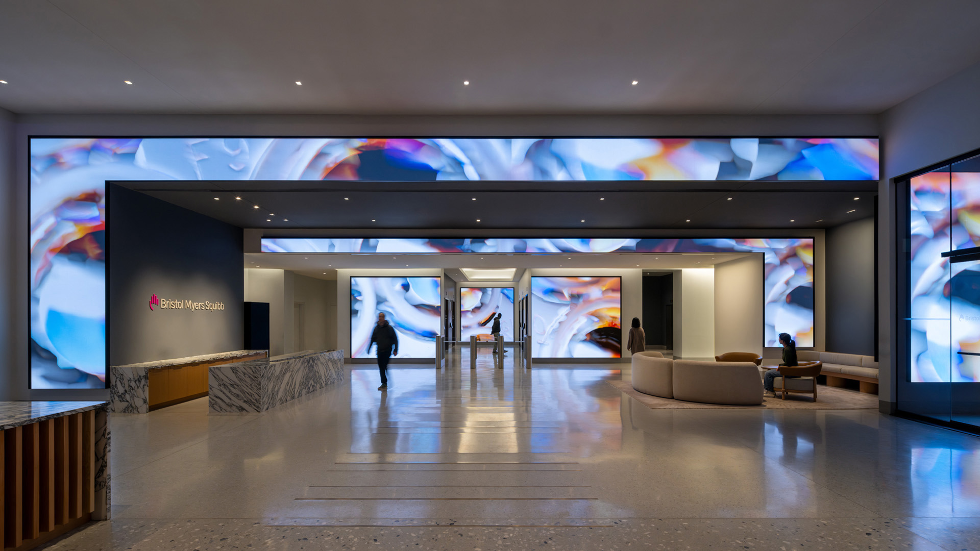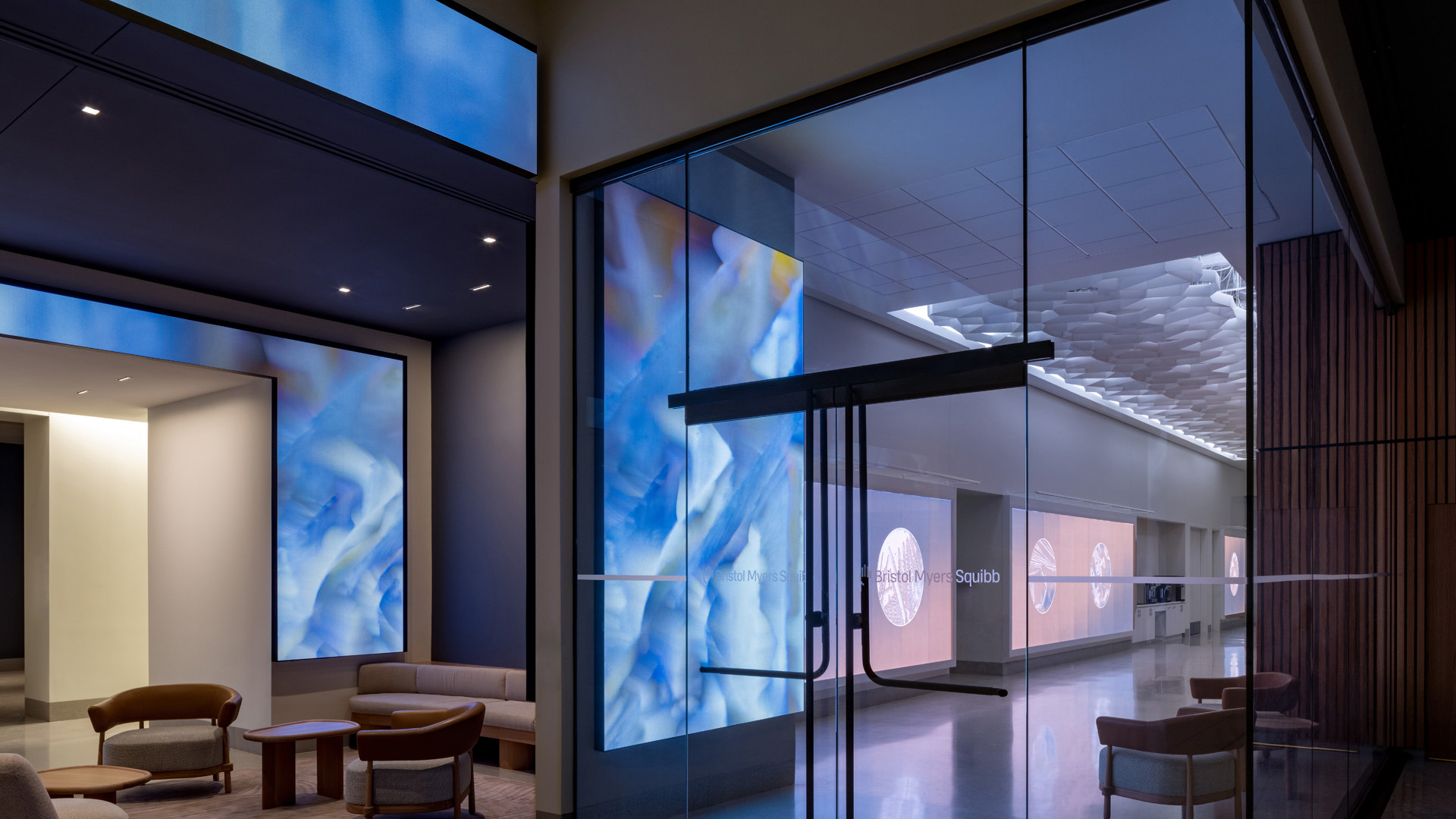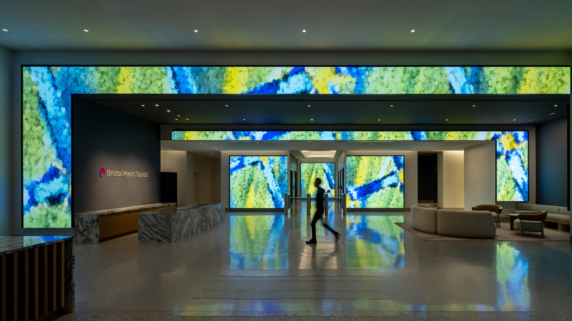Bristol Myers Squibb aimed to create an immersive and memorable lobby experience to showcase its pillars of discovery, development and data across cancer, cardiovascular, immunology and neuroscience. The goal was to engage visitors through an evolving narrative showcasing scientific advancements while providing a welcoming and inspiring environment for employees and guests.