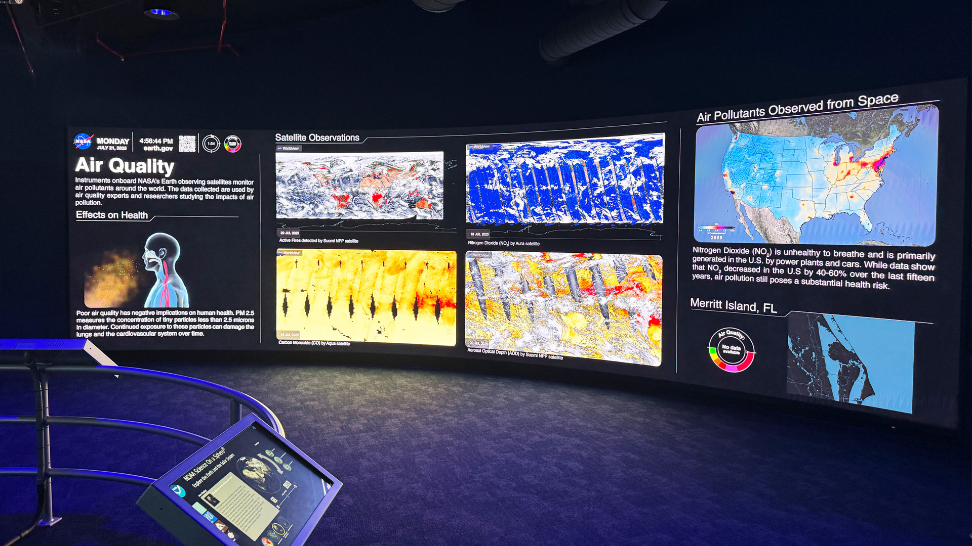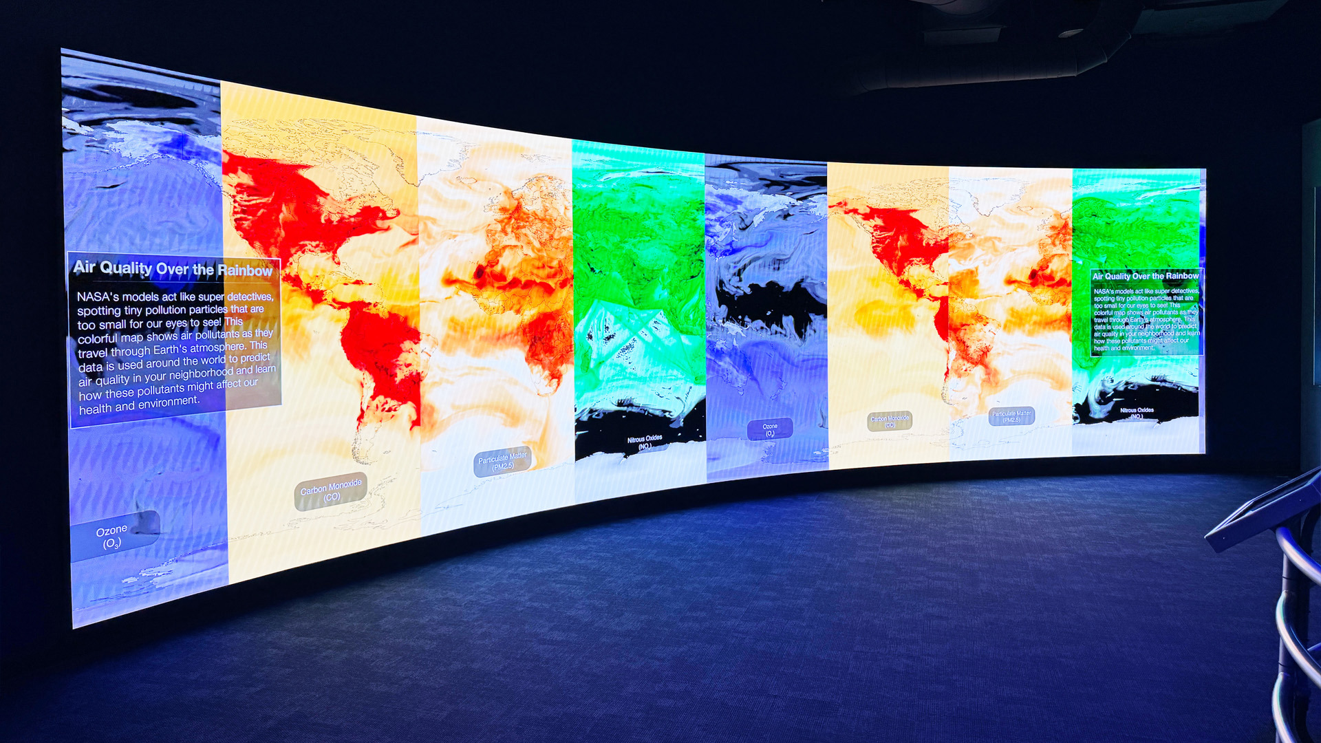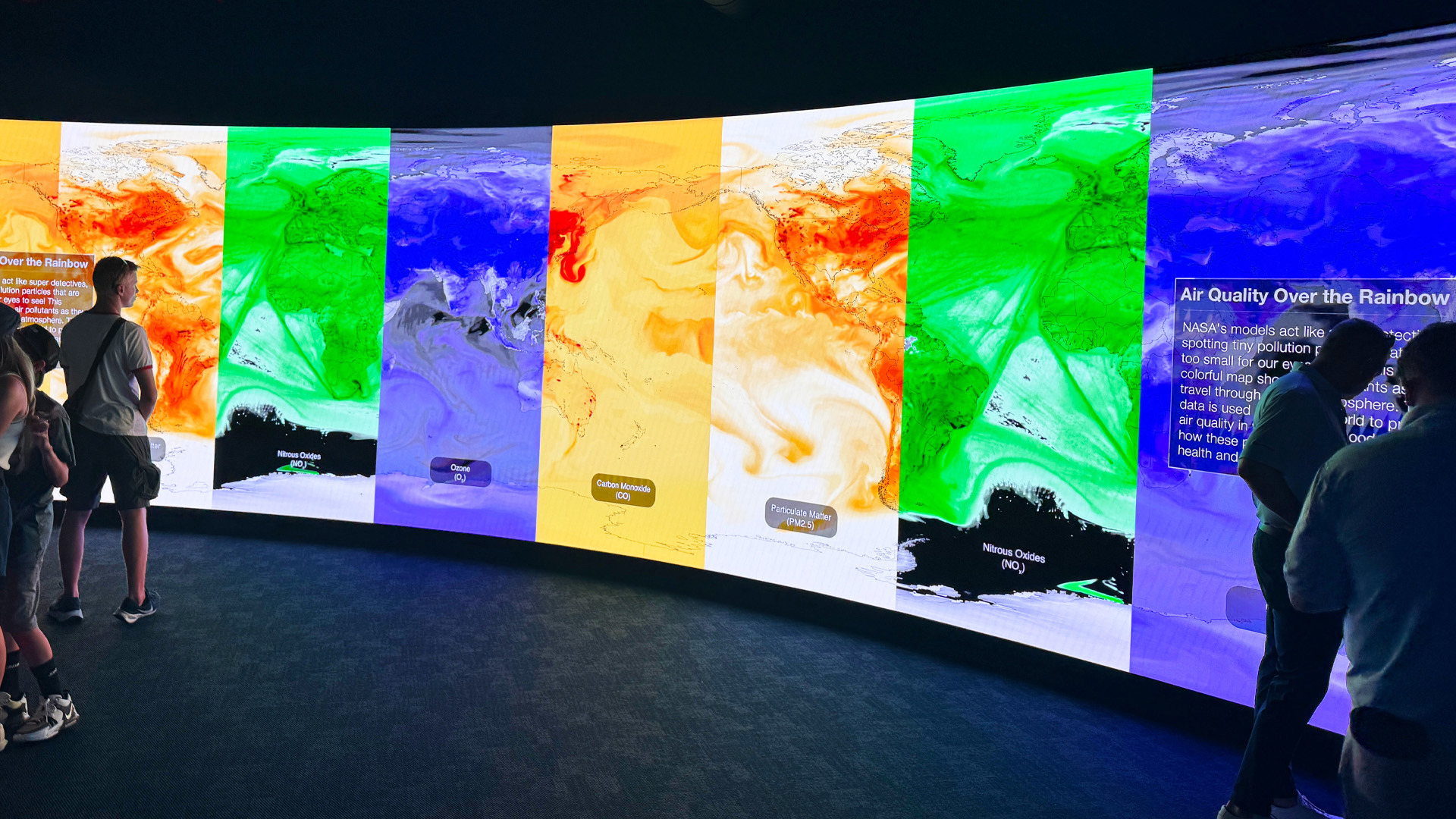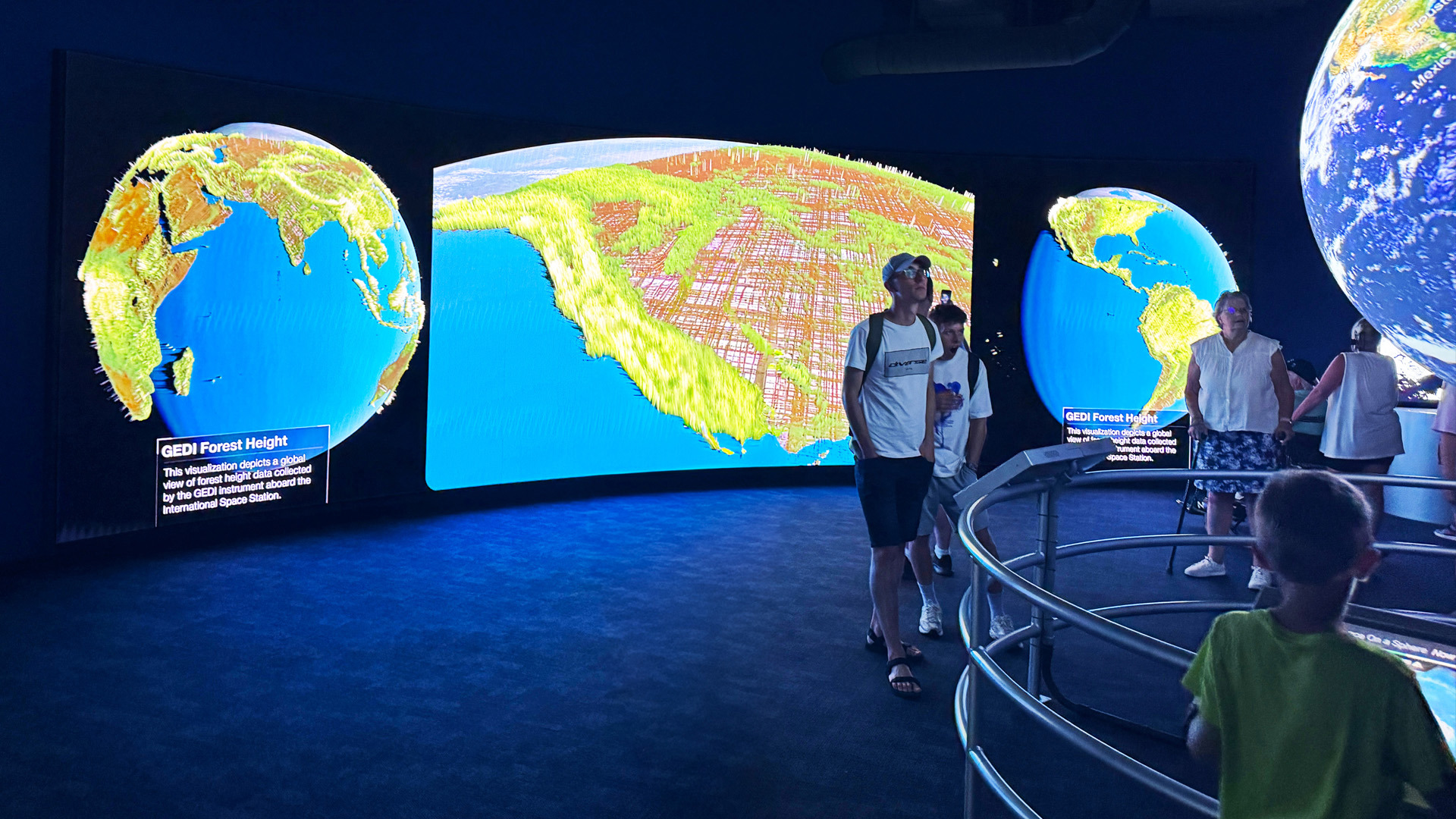 At the heart of the stadium, a 24' x 14' Fortis Plus 6mm Streaming Display broadcasts live NASA, SpaceX, and ULA feeds and daily educational content. Inside the Gallery Space, the 32' x 9' curved Earth Pulse Hyperwall presents live satellite data on climate, weather, and environmental events.