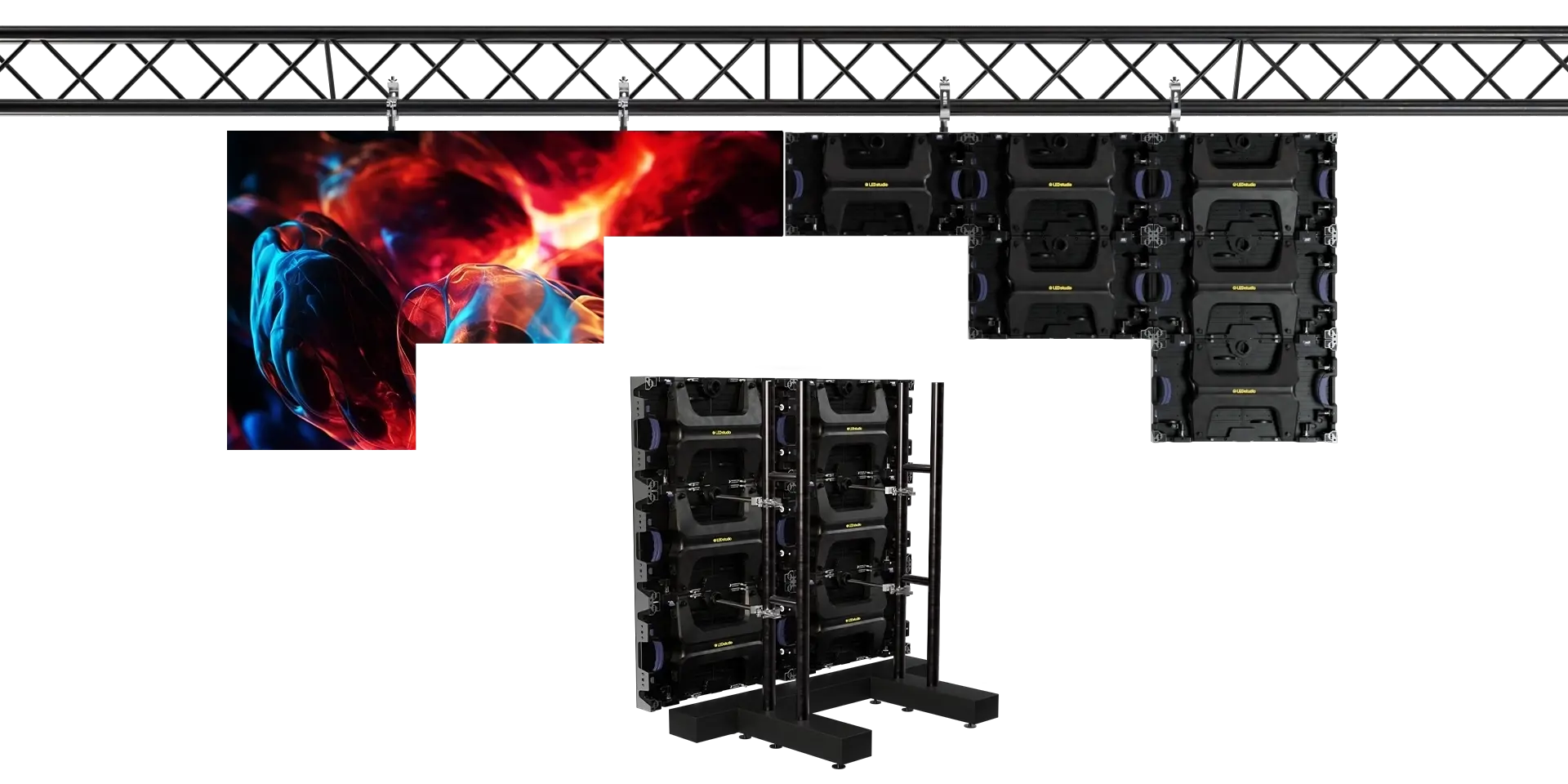 Ground stack or hanging truss fixing options allow for quick and efficient installation, catering to numerous live events and rental application setups, for swift and easy display deployment.