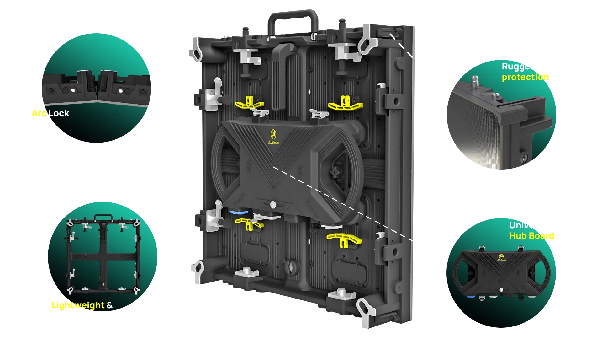 Universal power and hub card with compatibility across all pixel pitch options, enabling fast and efficient hot swapping in the event of faults.
